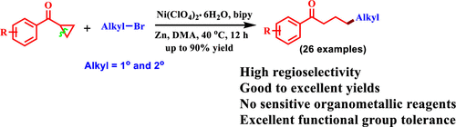 Abstract: A nickel-catalyzed reductive cross-coupling reaction of aryl cyclopropyl ketones with easily accessible unactivated alkyl bromides to access aryl alkyl ketones has been developed. This strategy facilitates access to various of γ-alkyl-substituted ketones via ring opening of cyclopropyl ketones (26 examples, 50–90% yield). Initial mechanistic studies revealed that the reaction proceeds via radical cleavage of the alkyl bromide.
