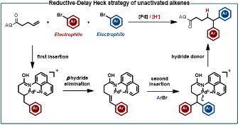 Abstract: Pd-catalyzed chemo- and regiocontrollable 1,1-diarylation of unactivated aliphatic alkenes with two aryl halides was developed. Under the cationic reductive-delay Heck pathway, the first aryl insertion is followed by β-H elimination, while the second aryl insertion is terminated by C−H bond formation.