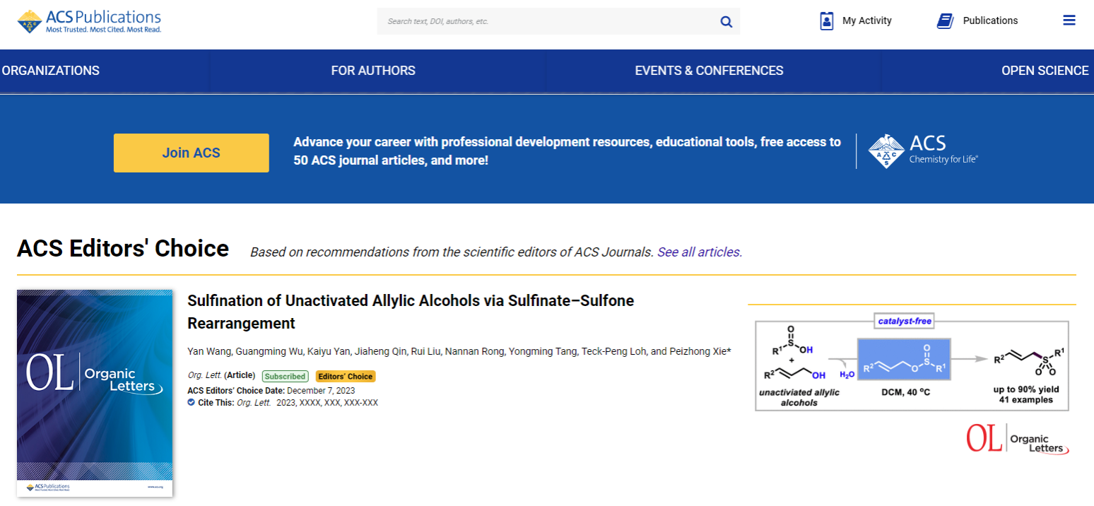 “ACS Editors' Choice”是美国化学学会(ACS)推出的一项扩大刊物影响力的举措。每天,ACS所有学术期刊(现有70本)中选取1篇具有重大科学意义的论文,即为“ACS Editors' Choice”论文。入选的论文会被推送到美国化学会网站首页,相当于每天的网站头条。截至目前,《Organic Letters》期刊在2023年共发表了1200余篇论文,入选ACS Editors' Choice的论文仅有6篇,入选率< 0.5%。