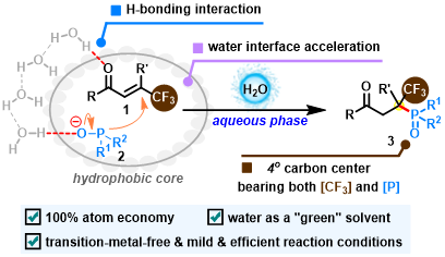 Abstract: The distinctive hydrophobic hydration effect in the aqueous solution contributes to the success of the phospha-Michael reaction between β-CF3-β,β-disubstituted enones and diarylphosphine oxides, providing an access to biologically relevant γ-ketophosphine oxides bearing a sterically highly congested CF3- and P(O)-tetrasubstituted carbon center. More importantly, the resulting products could be further transformed into densely functionalized γ-ketophosphine oxides containing a CF3- and P(O)-tetrasubstituted carbon center.