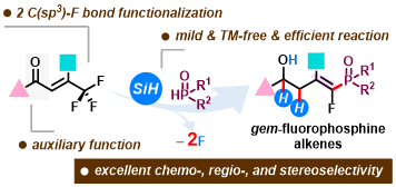 Abstract: A chemo-, regio-, and stereoselective reaction of trifluoromethyl enones, phenylsilane, and phosphine oxides through a sequential hydrodefluorination and defluorophosphorylation relay is developed for the synthesis of distinctive gem-fluorophosphine alkenes. This multi-component reaction occurred under transition-metal-free conditions with good functional group tolerance. Moreover, the pre-installed carbonyl auxiliary is important for tuning the reactivity of β-trifluoromethyl enones, thereby enabling controllable and selective functionalization of two fluorine atoms in trifluoromethylated enones.