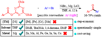 Abstract: Cross-electrophile coupling of triazine esters with aryl bromides could be facilely accomplished by employing nickel as catalyst, magnesium as metal mediator, and lithium chloride as additive. The reactions proceeded efficiently in THF at room temperature through C-O bond activation to afford an array of structurally different diaryl ketones in moderate to good yields with wide functional group tolerance. Control experiments showed that nickel, magnesium, lithium chloride, and THF are all indispensable for the good performance of the coupling reaction. Preliminary mechanistic exploration indicated that in situ formed arylmagnesium reagent by the insertion of magnesium into aryl bromide might serve as the key intermediate of the cross-coupling. The method which avoids the utilization of moisture-labile and relatively difficult-to-obtain organometallics is step-economical, cost-efficient, and operationally simple, potentially serving as an attractive alternative to documented methods.