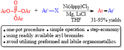 Abstract: A step-economical and operationally simple nickel-catalyzed cross-electrophile coupling of aryl phosphates with aryl bromides through C-O bond cleavage, which precluded the employment of relatively moisture-labile and unreadily available organometallics, was developed. The reaction proceeded smoothly in the presence of magnesium turnings and lithium chloride in THF to afford the corresponding biaryls in moderate to good yields with reasonable functionality tolerance.
