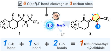 Abstract: An unprecedented defluorocyclization of perfluorobutyl tetralones with Na2S‧9H2O was developed for the synthesis of tri-fluoromethyl 1,2-dithioles, which provided chemists novel access to biologically and pharmaceutically relevant organofluo-rides. Successive C(sp3)-F bond functionalization at the perfluoroalkyl chain is vital for four C-H/C-S/S-S bonds formation and a five-membered S-heterocycle assembly. Cheap, low-toxic, and odorless inorganic sulfide Na2S‧9H2O acts as both a disulfurating precursor and a hydrodefluorinating reagent in this tandem multi-bond-interconverting reaction.