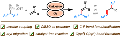 Abstract: An aerobic coupling of benzhydryl phosphonium salts with simple alkenes for accessing trisubstituted olefins is developed under metal-free, catalyst-free, and additive-free conditions. New C(sp3)−C(sp2) bond is constructed via the C−P and C−H bond functionalization by synergistically using O2 as a “green” oxidant and DMSO as a promoter. The method also distinguishes itself by its broad substrate scope and synthetic potential. Particularly, the use of 1,3,5-trimethoxybenzene fragment in the resulting products as a carbon-based leaving group for further transformations is proved to be feasible.