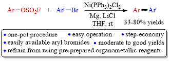Abstract: A one-pot, direct cross-coupling of aryl fluorosulfate with aryl bromide, which is step-economical and avoids the use of preprepared/commercial organometallic reagent, could be accomplished by performing the reaction in THF at room temperature in the presence of nickel catalyst, magnesium turnings, and lithium chloride, giving rise to the corresponding biaryls in moderate to good yields with reasonable functional group compatibility.