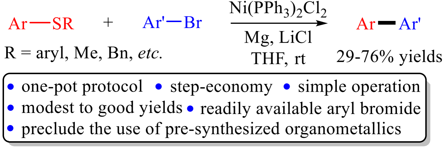 Abstract: A straightforward cross-coupling of aryl thioether with aryl bromide with the aid of nickel salt, magnesium, and lithium chloride in tetrahydrofuran at ambient temperature was accomplished. The one-pot reactions proceeded efficiently via C−S bond cleavage to produce the desired biaryls in modest to good yields, avoiding the use of pregenerated or commercial organometallic reagents.