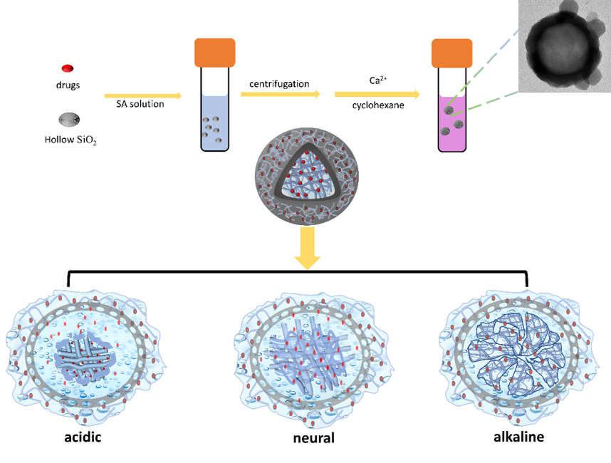 Abstract: we develop a novel alginate hydrogel supported by hollow silica microsphere for drug delivery. Briefly, the drugs were fused with sodium alginate and the hollow silica microspheres follow by ion crosslinking to form a composite hydrogel microsphere with a core-shell structure (SA@SiO2). On this basis, using three different types of organic compounds (rhodamine B, Indocyanine green and salicylic acid) as model molecules, the sustained-release performance of the SA@SiO2 microspheres were investigated in detail. The research results show that the drug delivery system has broad-spectrum sustained-release performance for different types of molecules, and the sustained-release time can exceed 40 hours. At the same time, the pH- responsive property of the sodium alginate hydrogel endows the delivery system with a certain targeting function. This study provides a new strategy for constructing an efficient targeted drug sustained-release system.