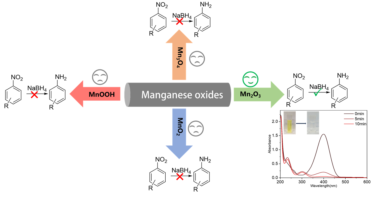 Abstract: The reduction of aromatic nitro compounds is the simplest and most widely used method for preparing aniline compounds, and widely used in chemistry, biology, medicine, dyes, and so on. Among them, reduction of aromatic nitro compounds by sodium borohydride usually requires noble metal-based catalyst, which results in difficulty in industrial application. In this letter, we report a discovery that the Mn2O3 nanorods can replace noble metal nanoparticles to efficiently catalyze the reduction of aromatic nitro compounds with different types of substituents by NaBH4, and moderate to excellent yields were obtained. By studying the similar catalytic performance of different manganese oxide materials, we proposed a plausible catalytic mechanism. Our discovery will open up new applications of manganese oxide materials in the field of catalysis.