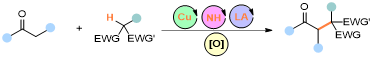 Abstract: In this study, we present a novel approach for the tertiary α-alkylation of ketones using alkanes with electron-deficient C−H bonds, employing a synergistic catalytic system combining inexpensive copper salts with aminocatalysis. This methodology addresses the limitations of traditional alkylation methods, such as the need for strong metallic bases, regioselectivity issues, and the risk of over alkylation, by providing a high reactivity and chemoselectivity without the necessity for pre-functionalized substrates. The dual catalytic strategy enables the direct functionalization of C(sp3)−H bonds, demonstrating remarkable selectivity in the presence of conventional C(sp3)−H bonds that are adjacent to heteroatoms or π systems, which are typically susceptible to single-electron transfer processes. Our findings contribute to the advancement of alkylation techniques, offering a practical and efficient route for the construction of C(sp3)−C(sp3) bonds, and paving the way for further developments in the synthesis of complex organic molecules.