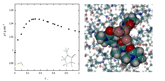 In the first, we use a combined experimental and modelling approach to study the structural organization of N-methyl-2-pyrrolidone + water mixtures. By a densitometry, x-ray diffraction, and molecular dynamics investigation, we explained why when adding water to an organic solvent having higher density than water density than water, the density increases instead of decreasing.